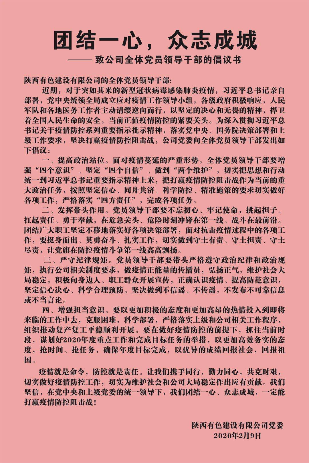 疫情就是命令、防控就是責(zé)任。近日,公司黨委發(fā)布了致公司全體黨員領(lǐng)導(dǎo)干部的倡議書,號召全體黨員干部切實(shí)提高政治站位,發(fā)揮帶頭作用,嚴(yán)守紀(jì)律規(guī)矩,增強(qiáng)擔(dān)當(dāng)意識,為公司疫情防控工作和公司穩(wěn)定大局作出貢獻(xiàn)。