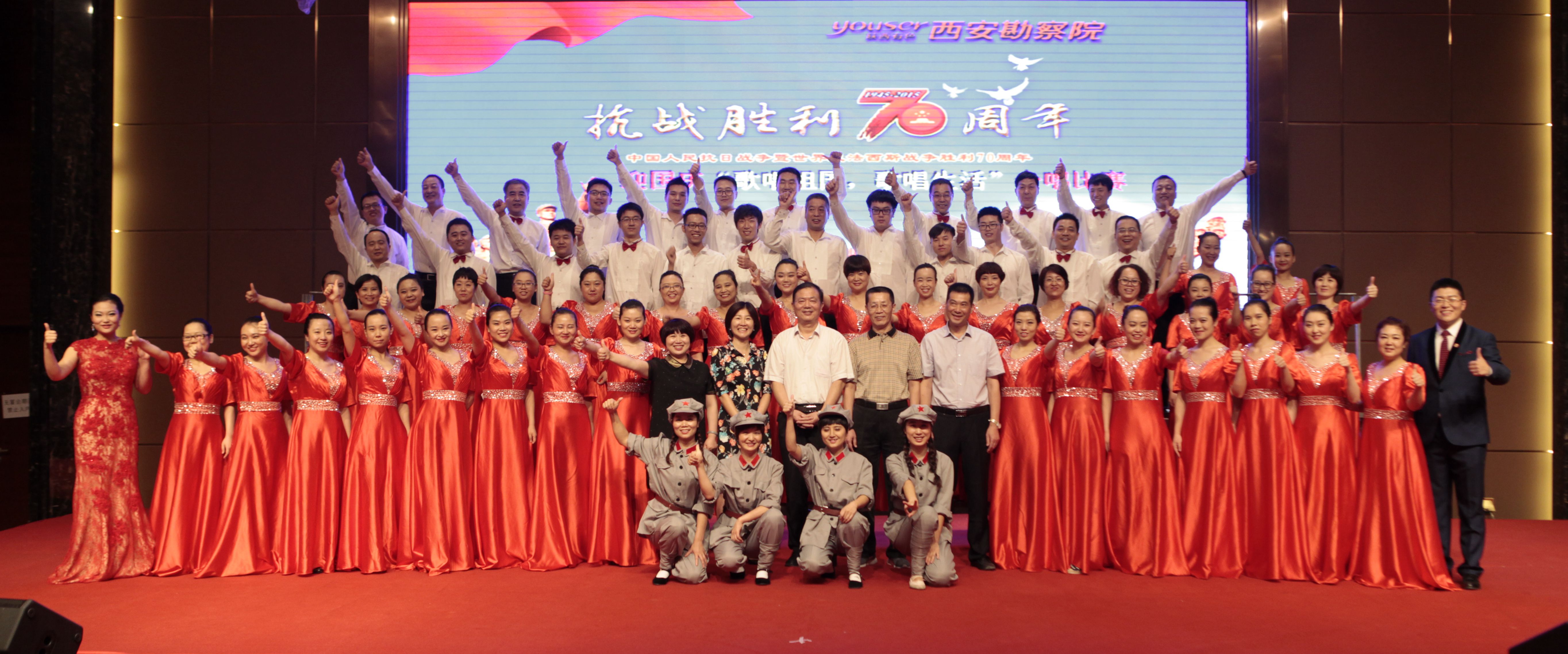 在曲江國(guó)際飯店的永寧大廳里,西勘院領(lǐng)導(dǎo)與500余名職工一同觀看了這次比賽。每個(gè)隊(duì)伍都準(zhǔn)備充足,拿出最佳水平,向祖國(guó)抗戰(zhàn)勝利七十周年獻(xiàn)禮。我公司選擇了《紅軍不怕遠(yuǎn)征難》和《走向復(fù)興》兩首歌曲,組織了有公司領(lǐng)導(dǎo)、職能部門(mén)負(fù)責(zé)人和員工60多人參加的合唱隊(duì),經(jīng)過(guò)一個(gè)多月的用心準(zhǔn)備,大家克服了工作和排練時(shí)間上的沖突,聽(tīng)從排練老師的指揮,每一次都有進(jìn)步和收獲,最終贏得了比賽的勝利。