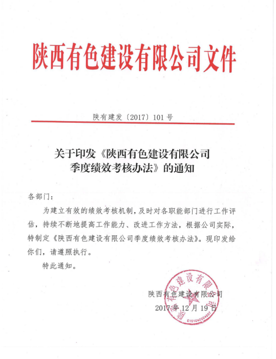 為建立有效的績效考核機制,實現(xiàn)績效考核逐步向績效管理轉(zhuǎn)變,公司人力資源部經(jīng)過認(rèn)真分析調(diào)研,根據(jù)公司實際情況,制定出臺了《陜西有色建設(shè)有限公司季度績效考核辦法》,經(jīng)公司董事長辦公會研究通過,于今年1月1日起正式實施。