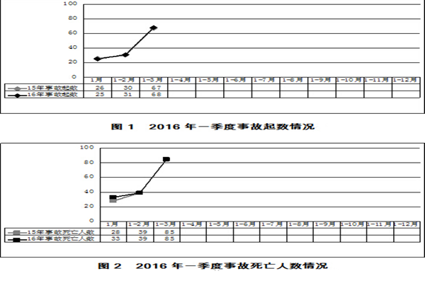 2016年一季度,全國(guó)共發(fā)生房屋市政工程生產(chǎn)安全事故68起、死亡85人,比去年同期事故起數(shù)增加1起,同比上升1.49%;死亡人數(shù)持平(見圖1、圖2)。
